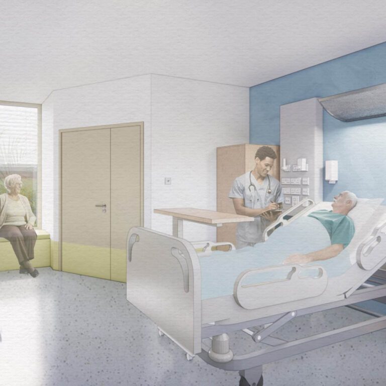 As the Concept Ward is being used as a ‘decant ward’ whilst remedial works take place in the main hospital, the new ward was designed to cater to all patient types. All of the single in-patient rooms in the Concept Ward will look out to grass; with 50% enjoying a view of the new therapy garden.
